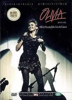 Olivia in Concert is a 1983 home video release of a concert by singer Olivia Newton-John. The concert was taped at Dee Events Center, Weber State University in Ogden, Utah on October 12 and 13, 1982, during Olivia's Physical Tour.[1] It originally premiered as a television special on HBO on January 23, 1983. The video charted at No. 15 on Billboard Top Videodisks and was certified gold by the Recording Industry Association of America for shipment of 50,000 units in the United States.[2] The video album was nominated for a Grammy as Best Video Album in 1983.[3]