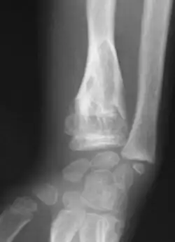 | X-ray image showing enchondromas localized in the lower part of the radius of a 7-year-old girl with Ollier disease. | |