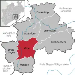 Olpe is a town situated in the foothills of the Ebbegebirge in North Rhine-Westphalia, roughly 60 km east of Cologne and 20 km northwest of Siegen. It is part of the Regierungsbezirk of Arnsberg and is the seat of the district of Olpe.