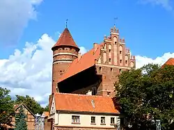 The castle was erected by the Warmian Cathedral Chapter as a stronghold against Lithuanians between 1346 and 1353.[4] It is made up of one wing to the north-east of the courtyard and was initially surrounded by a line of fortifications and a ditch which lead to the Łyna River with a bascule bridge. The south-east wing of the castle was built in the 15th century. The 40-meter tower dating back to the 14th century was placed in the eastern corner of the courtyard and reconstructed in the early 16th century, giving the castle a circular look in a square formation. During the reconstruction of the tower, the castle's fortifications were raised to 12 meters in height. This made the castle a major bastion located on the borders of Olsztyn, securing its entrance.[5]