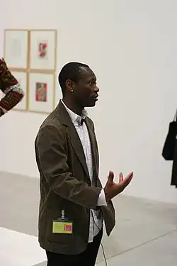 Olu Oguibe (born 14 October 1964) is a Nigerian-born American artist and academic.[1] Professor of Art and African-American Studies at the University of Connecticut, Storrs, Oguibe is a senior fellow of the Vera List Center for Art and Politics at the New School, New York City, and the Smithsonian Institution in Washington, DC.[2] He is also an art historian, art curator, and leading contributor to post-colonial theory and new information technology studies.[3][4] Oguibe is also known to be a well respected scholar and historian of contemporary African and African American art[5] and was honoured with the State of Connecticut Governor's Arts Award for excellence and lifetime achievement on 15 June 2013.[6]