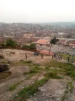 Olumo Rock is a mountain in south-western Nigeria. It is located in the city of Abeokuta, Ogun State, and was normally used as a natural fortress during inter-tribal warfare in the 19th century. Its patron spirit is venerated in the Yoruba religion as an orisha. In addition, Olumo Rock is an important paleontological archaeological site that has yielded an outstanding collection of stone tools such as hand axes, artificially shaped spherical rocks, pick-like tools and hammer rocks, dating back approximately 1.5 million years.[1] The name olumo is the combination of two words: "olu" which means god/deity, and "mo" which means moulded.[2]