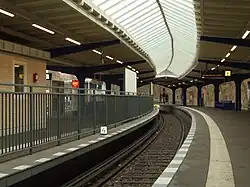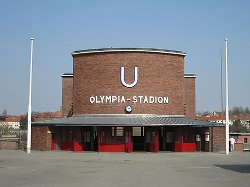 Olympia-Stadion is a Berlin U-Bahn station on line U2, in the Westend district. It serves Berlin's Olympic Stadium, where football matches and other events are regularly held. The station is located around 500 m (1,600 ft) from the similarly named S-Bahn station, Olympiastadion, whose name – without hyphen – more closely reflects that of the Olympic Stadium.