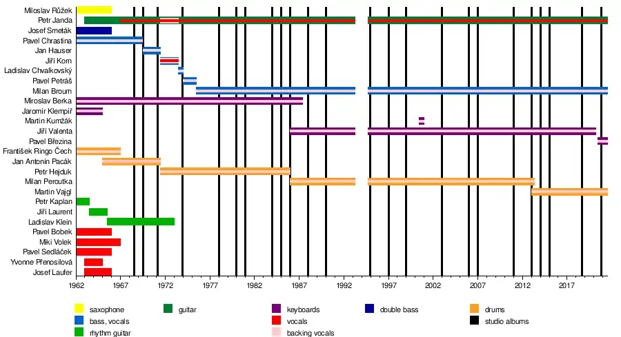 Jan Antonín Pacák had taken the place of Čech on drums in 1966 and was in turn replaced by Petr Hejduk, who died in 1985. Milan Peroutka took over drum duties and died in 2013. The band then took on current drummer, Martin Vajgl.[8]
