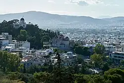 Athens lies in the center of four large mountains: Mount Aigaleo to the west, Mount Parnitha to the north, Mount Pentelicus to the northeast and Mount Hymettus to the east. The geographical area is called Athens Basin or the Attica Basin (Greek: Λεκανοπέδιο Αθηνών/Αττικής).[7] The meteorology of Athens is deemed to be one of the most complex in the world because its mountains cause a temperature inversion phenomenon.[8] The temperature that day was 32 °C (90 °F).[1]