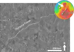 The Olympica Fossae are a set of troughs in the Tharsis quadrangle of Mars at 25° north latitude and 114.1° west longitude. They are about 420 km long and were named after an albedo feature at 17N, 134W.[1] Parts of the fossae have been suggested to be both outflow channels as well as channels for flowing lava, routing both molten rock and catastrophic outburst floods of water at different times in Mars' geological past.[2]