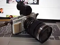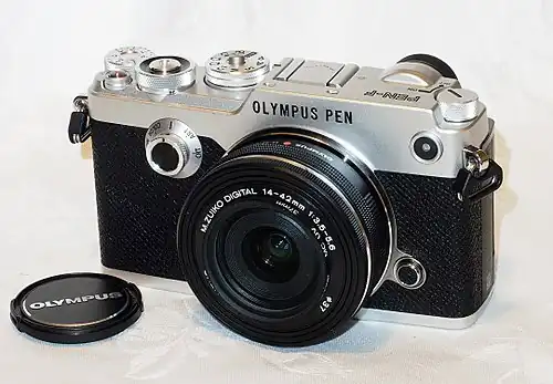 Main PEN range: The Olympus PEN E-P1 was the first digital PEN and the second camera in the Micro Four Thirds system. It revolutionized the camera market, because it was the first mirrorless camera which really took advantage of its kind. It included a 12 MP Four Thirds size sensor, which had the same image quality as a Four Thirds DSLR camera, but was packed in a much smaller body. It also included a 3-axis sensor-shift image stabilization system. It carries on in the PEN tradition[7] with its external design clearly inspired by the traditional PEN series. The next model in this category was the E-P2, released in April 2010, which did not include a whole lot of new features. One of them was the multi-functional accessory port under the hot shoe for an optional external electronic viewfinder or an external microphone. The next model to follow was the E-P3, released in 2011. It packed quite a few new features like 1080p video recording, a built-in flash, or a touch screen. Olympus claimed the E-P3 to have the world's fastest autofocus system.[8] The next model in this range was the E-P5 from 2013. It got some of its new features from the more professional OM-D E-M5, like the new 16 MP sensor and along with it, the 5-axis sensor stabilization system, and a tilting LCD screen. It had the max. shutter speed of 1/8000s, which was a whole new feature in Olympus Micro Four Thirds cameras. After 8 years, the main E-P series got updated in 2021, now under OM Digital Solutions' leadership. They skipped the number 6, and named the camera E-P7. The E-P7 shares a lot of its internals with the OM-D E-M10 Mark IV, but the design resembles the PEN-F. It lacks an electronic viewfinder, like the previous E-P models. It cannot be used with an external viewfinder though, unlike its predecessors.