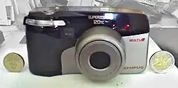 The Olympus Superzoom 120TC is a 35mm compact camera, most notable for being able to continuously shoot pictures at a rate of 4 frames per second. The 120 part of the model number represents the maximum telephoto focal length, the range being 35–120mm.[1] The TC part indicates that it has a self-timer, and can be activated by an infra-red remote control. Another notable feature is that the zoom lens moves at 2 different speeds depending on how hard the button is depressed.[2]