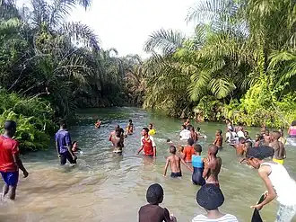The Anambra River (Igbo: Ọmambala) flows 210 kilometres (130 mi) into the Niger River and is found in Anambra, Nigeria.[3] The river is the most important feeder of the River Niger below Lokoja. The flow of the Ọmambala River is released into the Atlantic through various outlets forming the 25,000-square-kilometre (9,700 sq mi) Niger Delta region.[4]