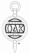 Omicron Delta Kappa's badge is a circular gold key with the Greek letters ΟΔΚ between two bars; the top bar has five stars and the bottom bar has the founding year 1914.[1][3] The five stars represent the five major phases of college life—athletics, campus or community service, communications, creative and performing arts, and scholarship.[9]
