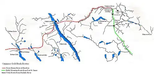 The Omineca Gold Rush was a gold rush in British Columbia, Canada, in the Omineca region of the Northern Interior of the province. Gold was first discovered there in 1861, but the rush did not begin until late in 1869 with the discovery at Vital Creek. There were several routes to the goldfields: two were from Fort St. James, one of which was a water route through the Stuart and Tachie Rivers to Trembleur Lake to Takla Lake and the other was overland, called the Baldy Mountain route. A third route came in overland from Hazelton on the Skeena River and a fourth route used the Fraser River and crossed over the Giscome Portage to Summit Lake, through McLeod Lake, and up the Finlay River to the Omineca River.[1]