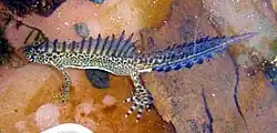 The tail is about the same length as the body and head. The limbs and digits are long, more so in males. Skin is almost smooth to slightly granular. During the terrestrial phase, the dorsum is reddish. During the aquatic phase, the dorsal and lateral surfaces are bronze-olive or olive-brown; there are small dark points on the back and a light band on flanks bordered with dark stripes. The belly is immaculate yellow to orange. During the breeding season, adult males develop very high and notched middorsal and caudal crest; the colouration is yellowish or brownish, with dark vertical stripes. Furthermore, their tails are covered with dark spots from above and with blue and/or greenish spots elsewhere.[3]