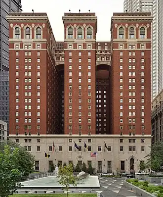 Built from 1915 to 1916, the $6 million William Penn opened on March 11, 1916, in what newspapers hailed as the Grandest Hotel in the nation, its first night it hosted the annual Pittsburgh Chamber of Commerce Gala and was recorded as the largest gala in city history up to that time with U.S. Secretary of State Philander Knox hosting the event.[7] The original hotel covered the western half of the block, facing Mellon Square.