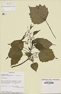 Omphalea ankaranensis is a tree up to 7 m tall. Leaves are heart-shaped, up to 16 cm long. Inflorescence is a racemous thyrse.[1]