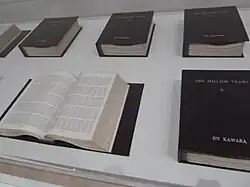 Kawara's first exhibitions include the first Nippon Exhibition, at the Tokyo Metropolitan Art Museum, in 1953, and at the Takemiya and Hibiya galleries the following year.[11] His work was exhibited at New York's Dwan Gallery in 1967, and his one-person exhibition "One Million Years" was shown in Düsseldorf, Paris, and Milan in 1971. Kawara's work was included in documenta 5 (1972), 7 (1982), and 11 (2002), in Kassel, and in the Tokyo Biennale (1970), the Kyoto Biennale (1976), and the Venice Biennale (1976).