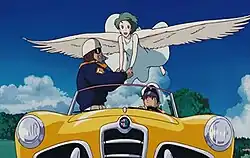 One of the men helps the girl up, she spreads her wings and gives them a grateful smile; he kisses her hand, and the other winks in farewell. Soon, she is drifting upward into the sky. Briefly, a major urban cityscape is seen beyond the trees. The car veers off the road and slows to a stop in the grass.