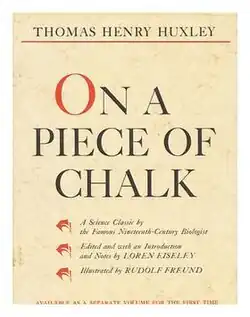 On a Piece of Chalk was a lecture given by Thomas Henry Huxley on 26 August 1868[1] to the working men of Norwich during a meeting of the British Association for the Advancement of Science.[2] It was published as an essay in Macmillan's Magazine in London later that year. The piece reconstructs the geological history of Britain from a simple piece of chalk and demonstrates science as "organized common sense".[3]