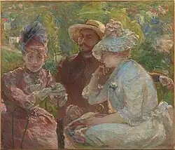 Similar to Bracquemond's other works, and to those of her female counterparts, critics note, the landscape is carefully considered, but is ultimately a mere backdrop for the figures depicted, who are the clear focus of the piece.[5]: 70 As in the other works she produced in 1880, Bracquemond explores the nature of the changing color of white in the light of the outdoors.[3] It is this period in time that historians identify Bracquemond's shift in influence from Ingres and Alfred Stevens to Impressionists Renoir and Monet.[6] This painting in particular is considered her most classically Impressionist piece, due to the incorporation of such gentle and free flowing brush strokes as well as light dispersion through foliage and onto the figures in the work, the use of shadows, and color selection.[5]: 70 Critics suggest that Bracquemond was additionally influenced, at least in content, by Felix Bracquemond's earlier work from 1876 entitled The Terrace (French: La Terasse), as it also depicts Marie and her sister on the Bracquemonds' terrace.[2]: 48 The firm features of the figures and treatment of light on fabrics are specific to Marie Bracquemond's individual artistic style, however.[4]: 65