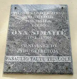 Ona Šimaitė (6 January 1894 – 17 January 1970) was a Lithuanian librarian at Vilnius University who used her position to aid and rescue Jews in the Vilna Ghetto during World War II. She is recognized as a Righteous Among the Nations.