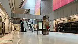 A Visual Narrative of Pandemonic Rhythmic Movement by Yek Wong is displayed at this station as part of the MRT network's Art-in-Transit (AiT) Programme, a public art showcase which integrates artworks into the MRT network. The three artwork panels represents life in the train station, showing people's movements throughout the day,[21] while the bright colours of the artwork illustrates the progression of time.[22] The white lines over the artwork reflect the dynamic energy of the station.[21][23] As a triptych, the work aim to evoke a poetic rhythm and are illuminated by natural light streaming through the skylights, giving a cathedral-like atmosphere to the station.[24]