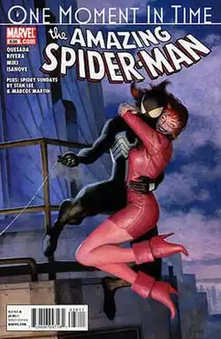 "One Moment in Time" is a 2010 comic book storyline published by Marvel Comics starring Spider-Man. Written by Joe Quesada and illustrated by Paolo Rivera, it was originally published in The Amazing Spider-Man #638โ641, and immediately follows "The Gauntlet" storyline. It is notable for revealing what changes the villain Mephisto made to save the life of Peter Parker/Spider-Man's aunt, May Parker, and dissolve the wedding of Parker and Mary Jane Watson at the end of the 2007 "One More Day" storyline.[1]