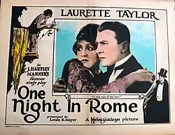 One Night in Rome is a 1924 American silent drama film starring Laurette Taylor. The film was directed by Clarence G. Badger and written by J. Hartley Manners, Taylor's husband, and based upon his play of the same name. Laurette Taylor was a great name of the American theatre, who made only three films in a triumph-studded career, all of them derived from plays by her husband.[1] This was the last of those three films (the previous two had been done by Metro Pictures). Taylor seems to have enjoyed making One Night in Rome as she kept a personal print of the movie to always show guests at her home, re-running it over and over again.[2]