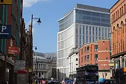 Construction began in May 2012 and was due to be completed in early 2014 to coincide with completion of the Central Library and Town Hall redevelopment. It then underwent internal fit out and was completed in late 2014.[14] Concern over the building's height surfaced during the construction of the core. One local observer said the building "is at least four storeys too tall on the site and the lift core alone makes the neighbours cower".[15] The building fronts onto Midland Hotel, Central Library and the Town Hall Extension – all Grade II* listed buildings.
