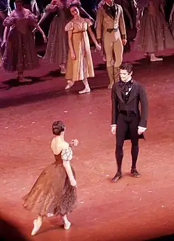 American Ballet Theatre debuted Onegin in 2001 at the Metropolitan Opera House. Tatiana and Onegin were danced by Julie Kent and Roberto Bolle. Later that year, The Royal Ballet made their company premiere, with Tamara Rojo and Adam Cooper in the lead roles. Both productions were staged by Anderson and choreologist Jane Bourne.[1][11] The Paris Opera Ballet first performed Onegin in 2009, starring Hervé Moreau and Isabelle Ciaravola. Both Ciaravola and Mathias Heymann, who played Lensky, were named étoile at the curtain call of that performance.[12]