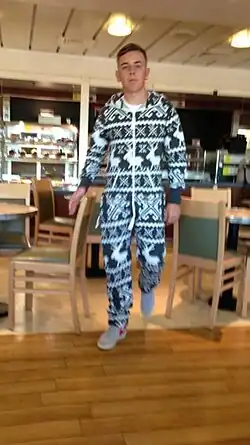 A onesie (/ˈwʌnzi/) is a type of loose-fitting casual jumpsuit in adult sizes made of knit cotton (as used in sweatshirts), fleece, or chenille.[1] They were mostly intended as loungewear or sleepwear, but have gained significant popularity as stylish streetwear, especially in the United Kingdom and Australia, becoming increasingly popular during the late 2000s and early 2010s as a street fashion. In 2016 the onesie also appeared in Switzerland. After onesies lost importance, in the UK the onesie made a comeback in the 2022 energy crisis to save heating costs as a warm and comfortable garment.[2]