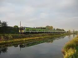 Ongar is served by Hansfield railway station, which opened in June 2013 and is a 10/15 minute walk from Ongar. The station is on the Dublin Docklands to Dunboyne railway station / M3 Parkway railway station commuter route, its position on the Dunboyne commuter line sees it served by 45 trains daily, with a peak journey time of 25 minutes to Docklands or Connolly Station, itself a spur off the Dublin to Maynooth commuter route to the west of Clonsilla Station. Connection to the Luas Green Line, and ultimately the two Luas lines, is possible via the Luas Broombridge stop.[12]