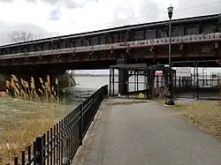 In Fall 2018, the northernmost end of the trail -- being that portion running under the double-tracked CSX mainline and terminating at a viewing area for Onondaga Lake -- was announced as closed indefinitely due to ice and waves having eroded the pavement.[9] At the time, repairs were said to be awaiting construction of the Onondaga Lake Lounge, which was planned as a larger and more formal viewing area along the lake. However, since that time, the lakeview terminus has had its gates open more often than not, even during the heart of winter, when Onondaga Lake's visiting population of Bald Eagles peaks.