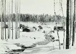 Construction began in 1938 on a road to connect Highway 17 at Nipigon with the gold mines discovered near the town of Geraldton several years earlier.[47][48] Although portions of this new road were passable by the end of 1939,[49] the Nipigon–Geraldton Highway was opened ceremoniously by Thomas McQuesten and C. D. Howe on September 7, 1940;[50] it was assumed as a provincial highway in 1941.[51] With the onset of World War II, the need for an east–west connection across Canada became imperative,[52] and construction began on a link between Geraldton and Hearst, a distance of 247 kilometres (153 mi) in 1939. Due to the shortage of labour, several prison camps were established between the two communities in October of that year and work began to clear a tote road for the movement of supplies over the following winter.[53][54] While the highway was completed in November 1942, it was not maintained during through the winter, and the official opening did not take place until June 12, 1943.[55] Following this, Highway 11 was extended to Nipigon, and was 1,421.1 kilometres (883.0 mi) long.[56]