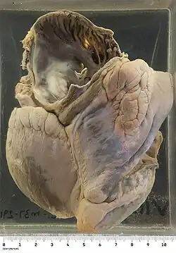 | Autopsy specimen of the heart of an individual with Onyalai. Heart shows haemorrhages throughout, particularly in the right atrium, which has been opened to reveal its interior surface. | |