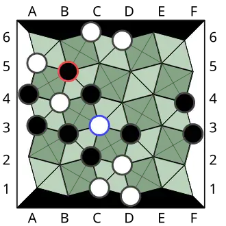 For example, if Black places a stone on [B5] as shown on the 6×6 mini-board, that completes the square {AB-45} and the White stones at [A5] and [B4] are captured. The illustration also shows a double-capture: if White places a stone on [C3], that completes two squares ({BC-34} and {CD-23}) and the Black stones at [B3], [C2], [C4], and [D3] are all captured and removed from the board. If Black moves first and captures the two White stones, the double-capture cannot occur as the [B4] corner would no longer be occupied after the capture and removal.