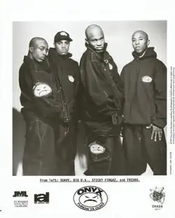 Onyx is an American hardcore hip hop group from New York City, formed in 1988 by Fredro Starr, Suavé (also known as Sonny Seeza) and the late Big DS. Sticky Fingaz joined the group in 1991.