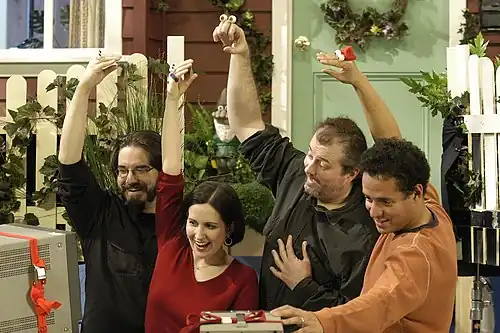 Tim Lagasse was chosen to play Oobi because of his previous bare-handed puppetry in A Show of Hands, a series of short films he made in the early 1990s.[16] The show's main cast and crew members were all Sesame Workshop alumni. Kevin Clash, best known for being the original performer of Elmo, was an ensemble puppeteer on Oobi and guest-starred as Randy in the episode, "Babysitter!".[20] Matt Vogel, the current puppeteer for Kermit the Frog and Big Bird, played Oobi's friend Angus. Martin Robinson, who plays Telly Monster on Sesame Street, built the puppets' glass eyes and accessories on Oobi.[16] Lisa Simon, who won 20 Daytime Emmys for her work as a director of Sesame Street, was the producer for Oobi.[21] The show's background music was created by Sacred Noise, a music production company in New York. Additional music was composed by pianist Marianna Rosett[22] and Christopher North Renquist.[20][23] A few other composers were brought onto the crew for special songs. Jared Faber wrote the theme song.[24] Broadway orchestrator Larry Hochman wrote songs for the "Theater!" episode, which was a ten-minute musical.[25]