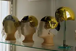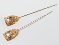 The wide gold earizer that was worn in the province of Friesland around 1870 is the culmination of a three-century development. At the end of the 16th century, a narrow metal bracket became fashionable in the Netherlands for clamping a hat to the head. The side with a decorated button rested on the cheek, slightly pressing into the cheek as a result.[1] It became a piece of jewelry made of silver or gold. However, ear-irons made of gilded copper have also been found. Around 1650 the earizer went out of fashion, but in the countryside and in orphanages, among other places, the ear-iron remained part of the dress. It was a form of dowry. Until the French period, the Frisian earizer changed little. The bracket widened slightly and the decorated button took the shape of a bird's head or griffin.