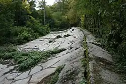 Since 1946, the use of the Opel racetrack has been completely abandoned, but the facility was not demolished. In 1949 the lease with the city of Mainz expired. As a result, holes were made in the slope in order to plant trees there. In the 1960s, part of the home straight was demolished in order to facilitate the new construction of the L3012 state road. The slope is partly overgrown today, but it is still easy to see; in particular the steep wall curves are almost completely preserved. More recently, the historic complex has been integrated into the Rhein-Main Regional Park as an industrial heritage site.[4] A small, accessible platform with information boards has been protruding into the north curve since 2013.