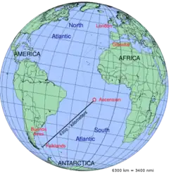 During the early 1980s, British defence planning was focused on the Cold War confrontation with the Soviet Union. Nonetheless, at six-monthly intervals the Defence chiefs reviewed other possible areas of conflict around the globe, including the Falkland Islands. The consensus was that they were indefensible.[1] The nearest airfield usable for operations was on Ascension Island, a British territory in the South Atlantic not far from the equator with a single 10,000-foot (3,000 m) runway at Wideawake airfield that lay 3,700 nautical miles (4,300 mi; 6,900 km) from the UK and 3,300 nautical miles (3,800 mi; 6,100 km) from the Falklands.[2][3] Without aircraft able to cover the long distance, the Royal Air Force (RAF) could not envisage carrying out operations in the South Atlantic. Activities in the South Atlantic would be carried out by the Royal Navy and the British Army, with the RAF's role restricted to the Hawker Siddeley Nimrod maritime patrol aircraft and logistic support of the base at Ascension by Vickers VC10 and Lockheed C-130 Hercules transport aircraft.[1][4]