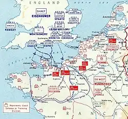 By 1943, Hitler was defending the entire western coast of Europe, with no clear knowledge of where an Allied invasion might land. His tactic was to defend the entire length and to rely on reinforcements to respond to any landings quickly. In France the Germans deployed two Army Groups. One of them, Army Group B, was deployed to protect the coastline; the Fifteenth Army covering the Pas-de-Calais region and the Seventh Army in Normandy.[5] Following a decision to defer the invasion, Operation Overlord, until 1944, the Allies conducted a series of deceptions intended to threaten invasion in Norway and France. Bodyguard was preceded in late 1943 by Operation Cockade, which was intended to confuse the German high command as to Allied intentions and to draw them into air battles across the Channel. In that respect, Cockade was not a success, with German forces barely responding even as a fake invasion force crossed the channel and turned back some distance from its "target".[6]