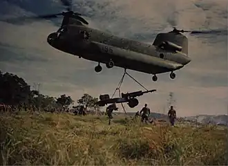![]() A CH-47 lands a 105mm howitzer 20km northwest of Tuy Hoa, 19 September 1967 | |||||||