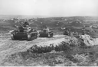 ![]() A column of German Panzer III tanks travelling down an unpaved road near the Don River, July 1942 | |||||||
