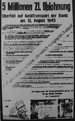 Following the German invasion and occupation of Poland in 1939, a large resistance network was formed. That resistance required funds to operate, and the resources of the Polish government in exile, delivered through the cichociemni commando-couriers, were limited.[2] In 1942 the resistance began planning to acquire money from the occupiers by carrying out large-scale robberies.[1] Having learned that a large quantity of money would be moved by the occupiers to the German-established Bank of Issue in Poland, the resistance recruited a number of sympathizers within the bank.[1] Preparations lasted about 14 months.[2]