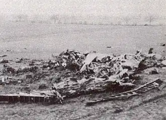 ![]() A Handley Page Halifax HX332 of No. 10 Squadron RAF burned out in a Yorkshire field. 5 out of the 7 occupants were killed when the aircraft was shot down by Leutnant Arnold Döring. It was one of 34 aircraft damaged or destroyed by Gisela. | |||||||