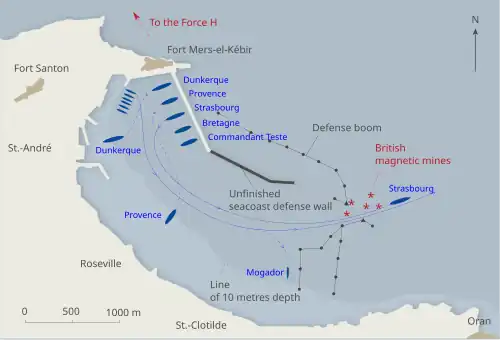The most powerful group of French warships was commanded by Admiral Marcel-Bruno Gensoul at Mers-el-Kébir in French Algeria, comprising the old battleships Provence (commander of the 2nd Battleship Division, Rear-Admiral Jacques Bouxin, embarked) and Bretagne (Captain Le Pivain), the newer Force de Raid battleships Dunkerque (Captain Barois) and Strasbourg (Captain Louis Collinet), the seaplane tender Commandant Teste (Captain Lemaire), a flotilla of six destroyers comprising Mogador, Volta, Tigre, Lynx, Kersaint and Le Terrible (Rear-Admiral Émile-Marie Lacroix) and a gunboat Rigault de Genouilly (Louis Georges Emile Frossard).[16] Admiral James Somerville, commander of Force H, based in Gibraltar, was ordered to deliver an ultimatum to the French, the terms of which were contrary to the German–French armistice.[14][b]