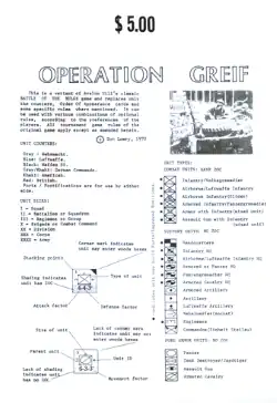 Operation Greif is a two-person variant for the 1965 edition of Battle of the Bulge, later updated to conform to the 1981 edition. Only new counters and rules are provided; the original map board from Battle of the Bulge is required for play.