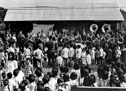 At noon, the Americans provided a lunch of hot dogs, potato salad, milk, juice, and other side dishes and drinks. The Americans reported that the people were curious and commented about the unfamiliar taste of the food, which was rather different from their rice-dominant diet, but that many returned for second and third helpings.[6] The first day of festivities ended at around 1530 after the 1st Infantry Division Band had finished marching through the streets playing tunes. According to an American military report "It was not just a concert but a weapon in 'the other war.'"[1]