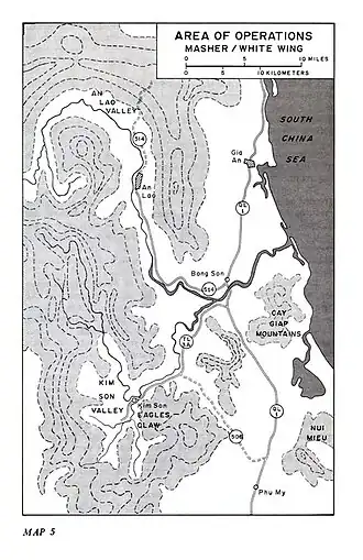 Operation Masher, also known as Operation White Wing, (24 January—6 March 1966) was the largest search and destroy mission that had been carried out in the Vietnam War up until that time.[6] It was a combined mission of the United States Army, Army of the Republic of Vietnam (ARVN), and Republic of Korea Army (ROK) in Bình Định Province on the central coast of South Vietnam. The People's Army of Vietnam (PAVN) 3rd Division, made up of two regiments of North Vietnamese regulars and one regiment of main force Viet Cong (VC) guerrillas, controlled much of the land and many of the people of Bình Định Province, which had a total population of about 800,000.[7]: 201 A CIA report in 1965 said that Binh Dinh was "just about lost" to the communists.[8]