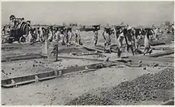 Some 1,000 ox carts, 15,000 wheelbarrows and 1,500 trucks were used to carry building materials. There were no bulldozers, power shovels or graders. The topsoil and some of the subsoil was removed with hoes and was carried away in wicker baskets on shoulder poles by men and boys. The subsoil was rolled flat using huge concrete rollers hauled by up to 300 workers. A layer of pebbles taken from nearby streams was laid down using wheelbarrows.[53][55] Over 300,000 cubic meters (390,000 cu yd) were used for the runways and taxiways.[54] Workers collected them from the banks of the Min River. When this source became depleted, they waded into the freezing rapids and shoals to collect them from the riverbed.[56] Rocks had to be used to supplement the pebbles. Men, women and children shaped them with hammers and chisels so they would not shift about. A slurry of topsoil and subsoil was laid atop the rocks as a binder, which was then rolled flat. Successive layers of rock and slurry were laid down.[53][57] Saunders landed the first B-29 at Guanghan on 24 April, where he was met by officials including Wolfe, Zhang, and Major General Claire L. Chennault, the commander of the China-based Fourteenth Air Force.[58] All four airfields were completed by 10 May 1944.[53][59]