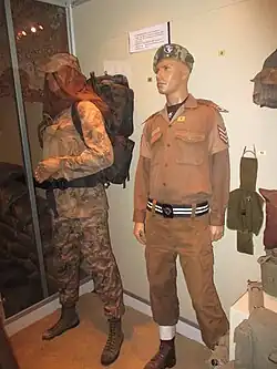 32 Battalion uniforms worn during Seiljag. To help keep their activities covert, the unit's personnel wore ubiquitous lizardstripe camouflage in Angola which mimicked Angolan military battledress. While operating in Ovamboland, 32 operators used the standard issue SADF brown fatigues.[1] | |||||||